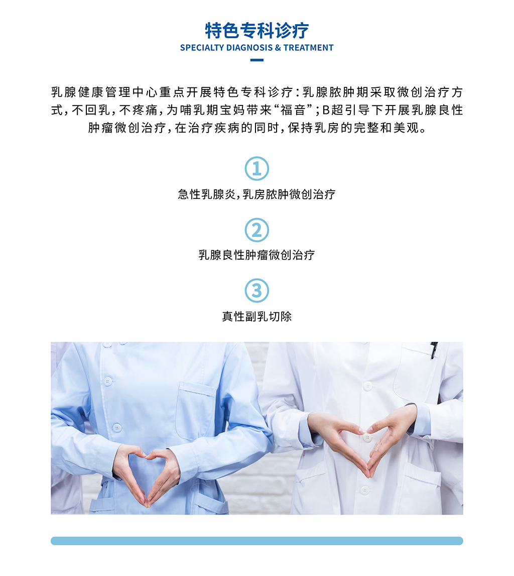 從女性乳房青春期發(fā)育異常,到成年常見的乳腺增生,到哺乳期好發(fā)的急性乳腺炎,到更年期好發(fā)的乳腺癌,對(duì)女性乳房健康的全生命周期健康管理。對(duì)乳腺疾病相關(guān)的學(xué)科,乳腺外科、整形美容科,婦科、內(nèi)分泌科,腫瘤科等相關(guān)學(xué)科進(jìn)行深度融合。以科學(xué)診療,個(gè)性化診療為特色,為女性乳腺健康保駕護(hù)航。