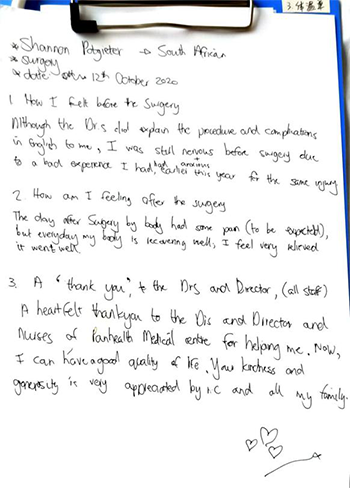 (Shannon Potgieter給醫(yī)院的親筆感謝信)
