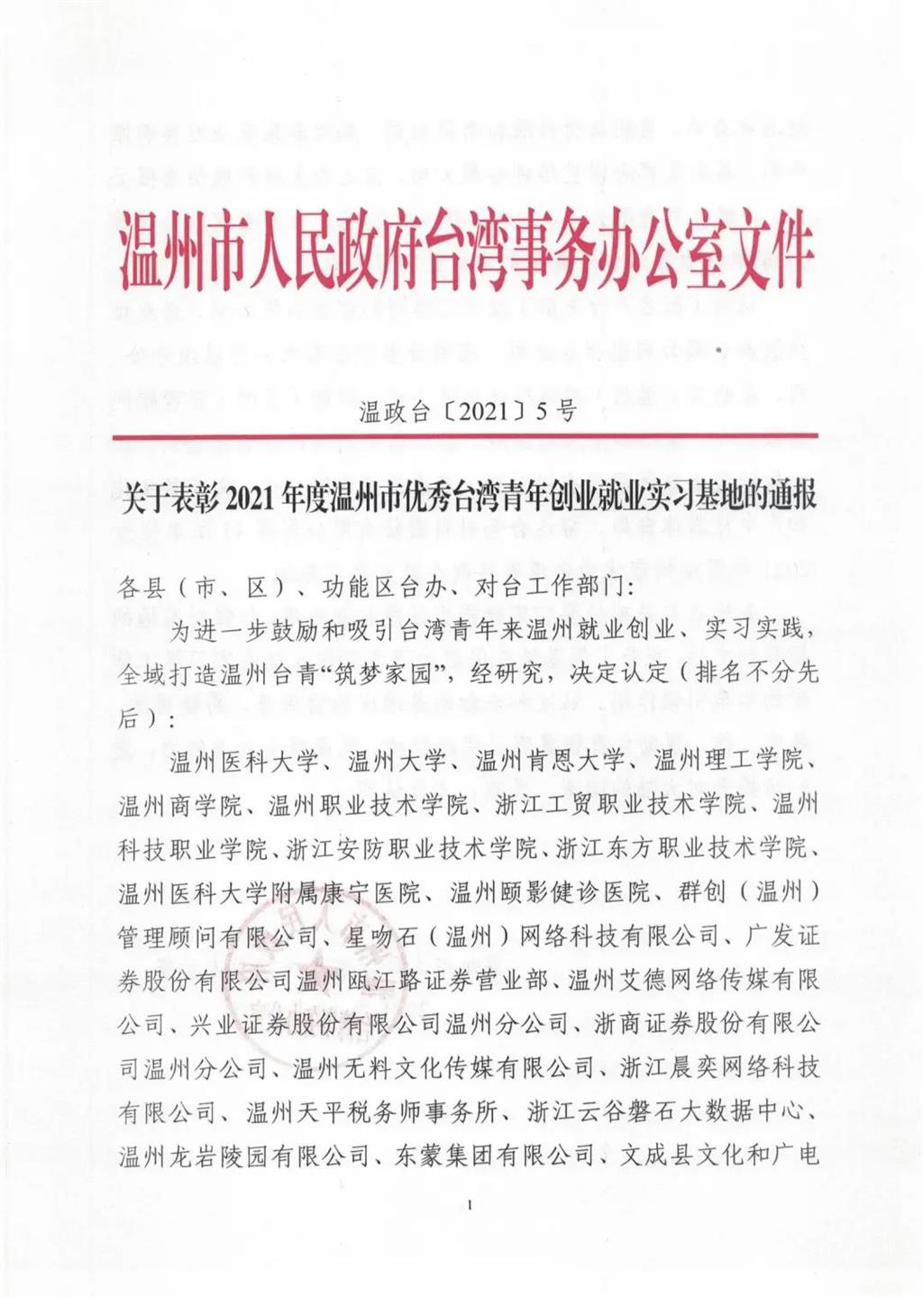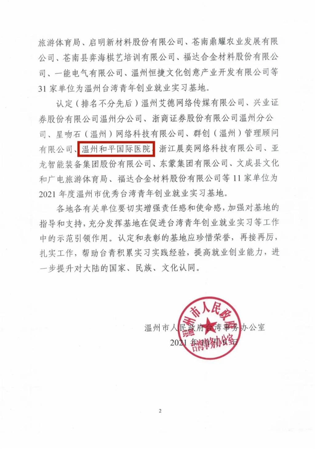 日前,溫州和平國(guó)際醫(yī)院榮獲“2021年度溫州市優(yōu)秀臺(tái)灣青年創(chuàng)業(yè)就業(yè)實(shí)習(xí)基地”稱號(hào)。據(jù)悉,這已是和平國(guó)際醫(yī)院連續(xù)三年獲得該稱號(hào)。
