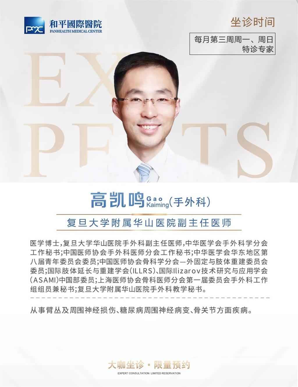 隨著社會的不斷發(fā)展進步,眾多創(chuàng)傷修復(fù)的患者對于手術(shù)的要求也在不斷提高。患者們希望一場手術(shù)治療,不僅能夠?qū)⑹軗p部位進行修復(fù),同時也能夠達到微創(chuàng)、淺疤乃至無創(chuàng)、無疤的手術(shù)效果,這一希望,不僅是患者對自身審美要求的提高,更是對醫(yī)師專業(yè)能力需求的提高。和平國際醫(yī)院創(chuàng)傷與創(chuàng)面修復(fù)科和平國際醫(yī)院創(chuàng)傷與創(chuàng)面修復(fù)科開展了創(chuàng)傷骨科、顯微外科、臂叢神經(jīng)損傷手內(nèi)在肌功能重建及四肢畸形矯正等相關(guān)手術(shù),并與溫州醫(yī)科大學藥學院聯(lián)合進行了創(chuàng)面修復(fù)的基礎(chǔ)和臨床研究。科室通過多個學科的通力合作,讓每一位進行治療的患者都能切身感受到,手術(shù)在治療病癥的同時,也能實現(xiàn)“手術(shù)最低傷害”。 和平國際醫(yī)院創(chuàng)傷與創(chuàng)面修復(fù)科擁有尖端的骨科基礎(chǔ)檢查設(shè)備,以及先進的手術(shù)配套設(shè)施,包括美國GE公司Discovery 750W型超導(dǎo)核磁共振、2間百級數(shù)字一體化手術(shù)室、11間層流手術(shù)室、以及德國貝朗關(guān)節(jié)鏡等一系列進口高端設(shè)備。為了滿足患者日益提高的診療需求,和平國際醫(yī)院開設(shè)了名醫(yī)館,特別邀請了復(fù)旦大學附屬華山醫(yī)院手外科副主任醫(yī)師、醫(yī)學博士高凱鳴來院坐診。高凱鳴長期從事于周圍(臂叢)神經(jīng)損傷及卡壓的臨床治療和科研研究工作,在臂叢及周圍神經(jīng)損傷的修復(fù)重建方面投入了大量精力,在上肢骨關(guān)節(jié)損傷修復(fù)以及微創(chuàng)治療領(lǐng)域有豐富的臨床經(jīng)驗。