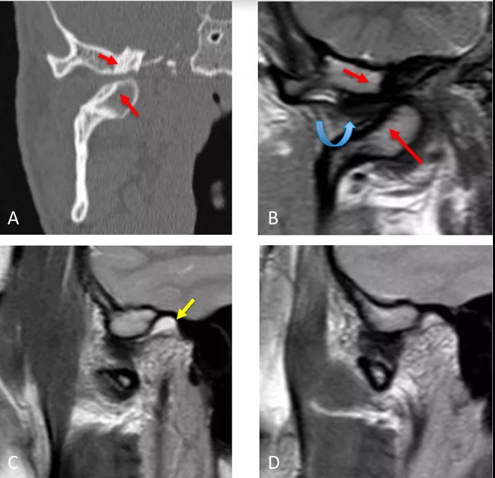冠狀面CT圖(A)和冠狀面PDWI圖(閉口)(B):顯示由于先前骨折導致的下頜髁突內(nèi)側移位的顳下頜關節(jié)脫位,與骨折畸形愈合、前上髁和后顳嵴硬化(紅色箭頭)相關。關節(jié)盤位于下頜骨髁突和顳突之間,失去正常的形態(tài)(彎曲箭頭)。
