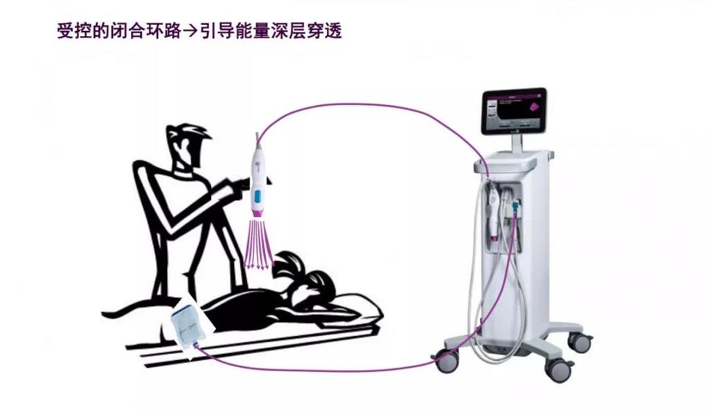 探頭通過皮膚表層傳導能量,穿透深度不僅能達到真皮層,還可以延伸至纖維間隔,既可以除皺,還能達到緊致提拉的效果