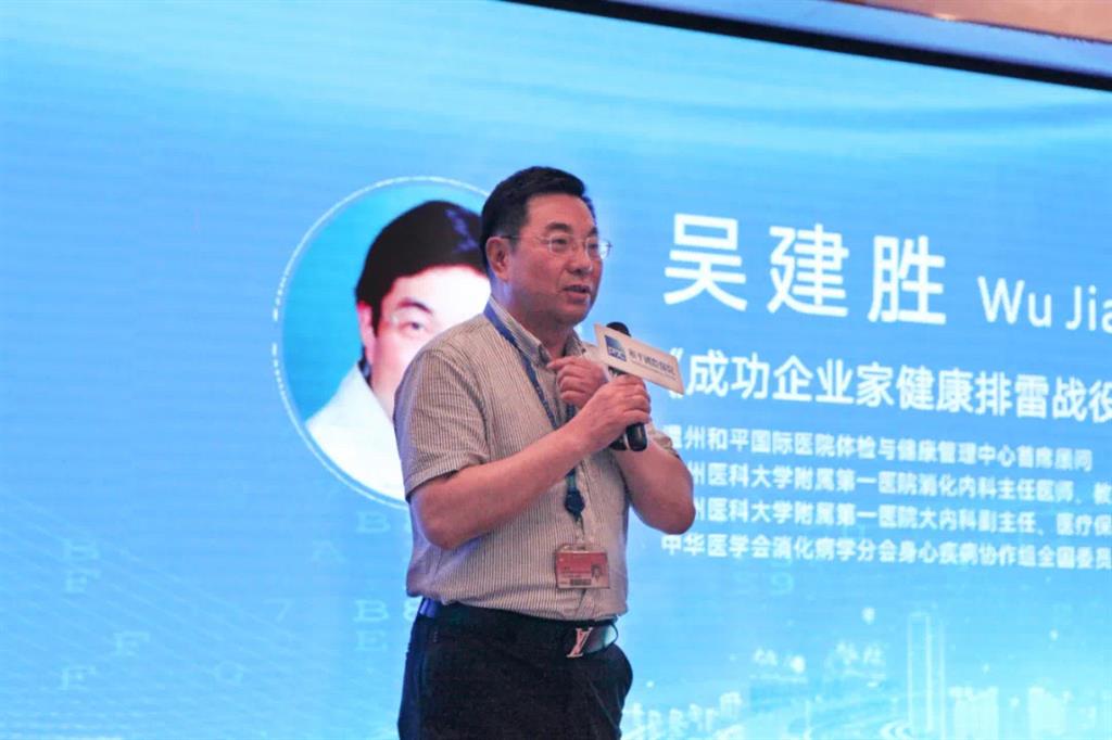 溫州和平國際醫(yī)院體檢與健康管理中心首席顧問、溫州醫(yī)科大學(xué)附屬第一醫(yī)院消化內(nèi)科主任醫(yī)師吳建勝教授,上臺分享《成功企業(yè)家健康排雷戰(zhàn)役——脂肪肝的前世今生》。